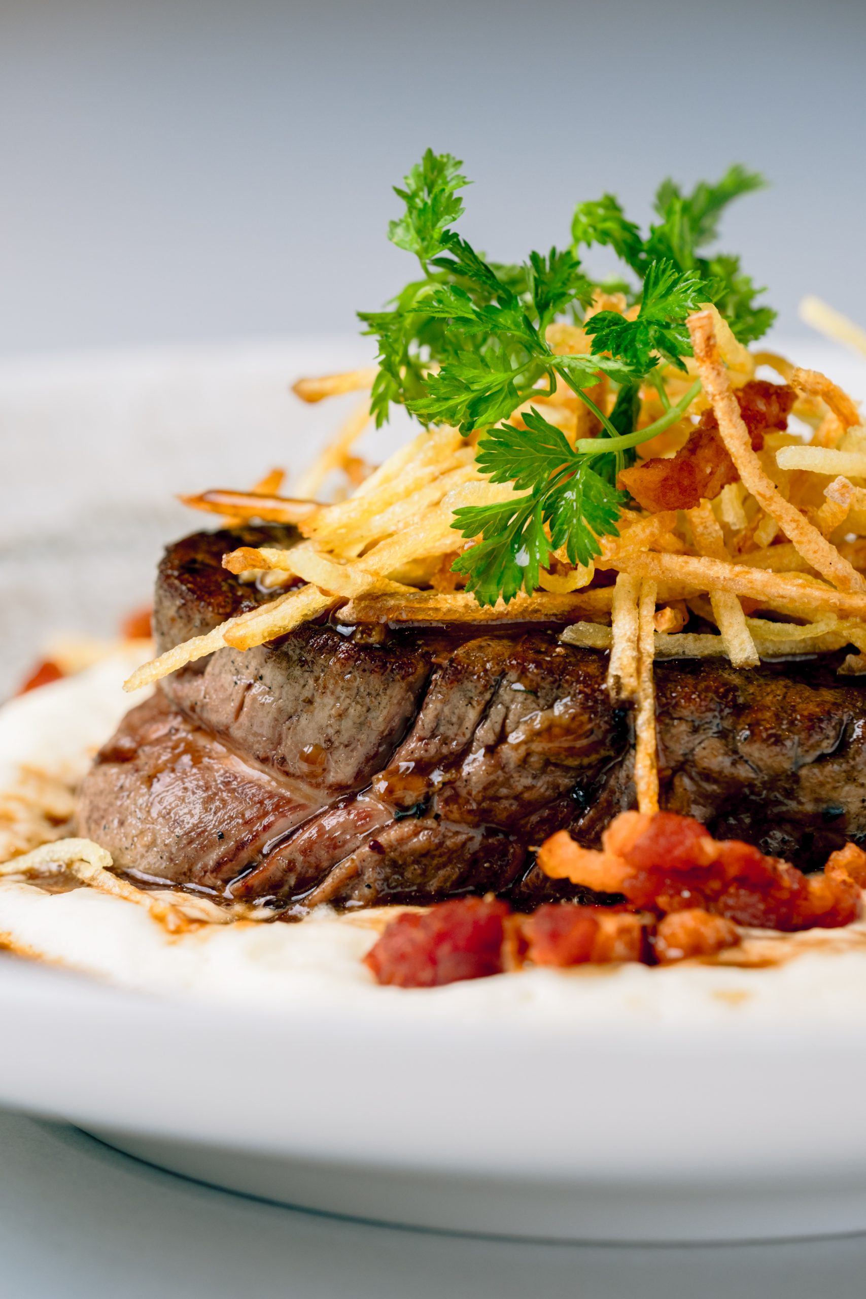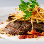 - Tournedos de taureau grillé, crémeux d’aligot, croquant de couenne, jus de viande 30 €